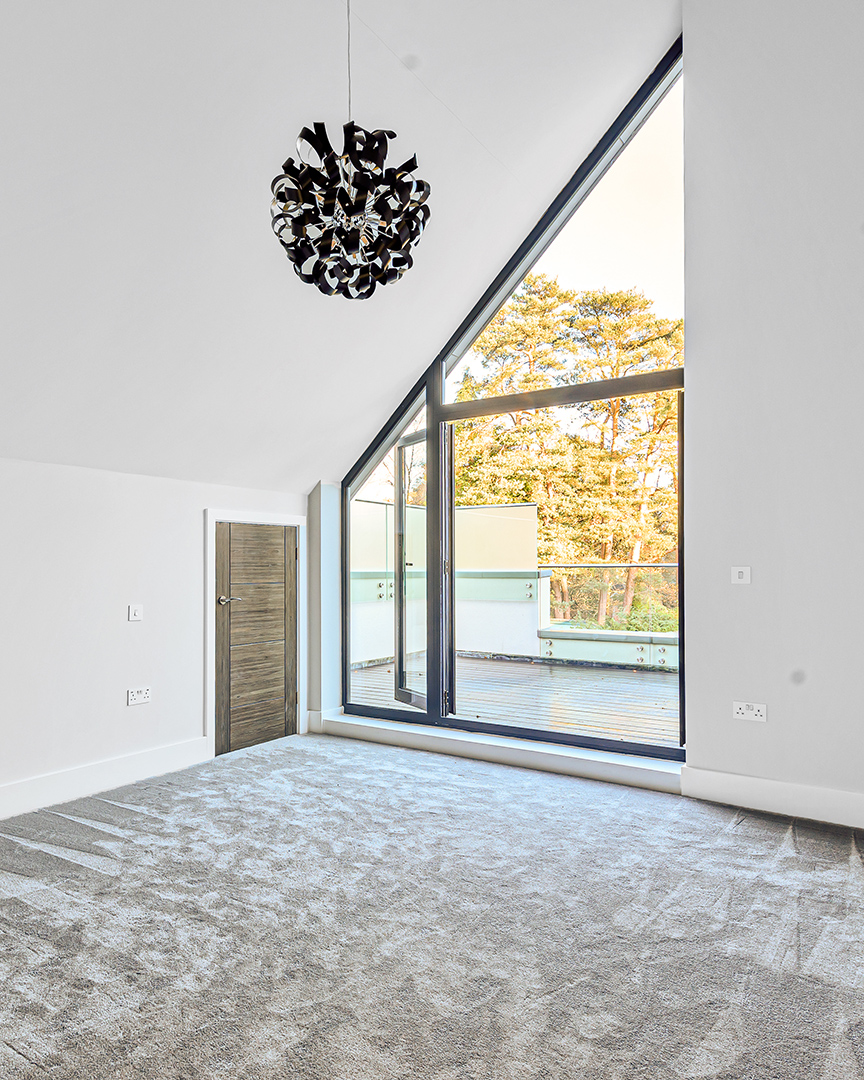 Externally the property is finished in crisp white render, slate pitched roof and zinc architectural detailing. In addition to the soft landscaping in the grounds, we provided areas of porcelain tiled patios and several roof terraces with glass balustrades.