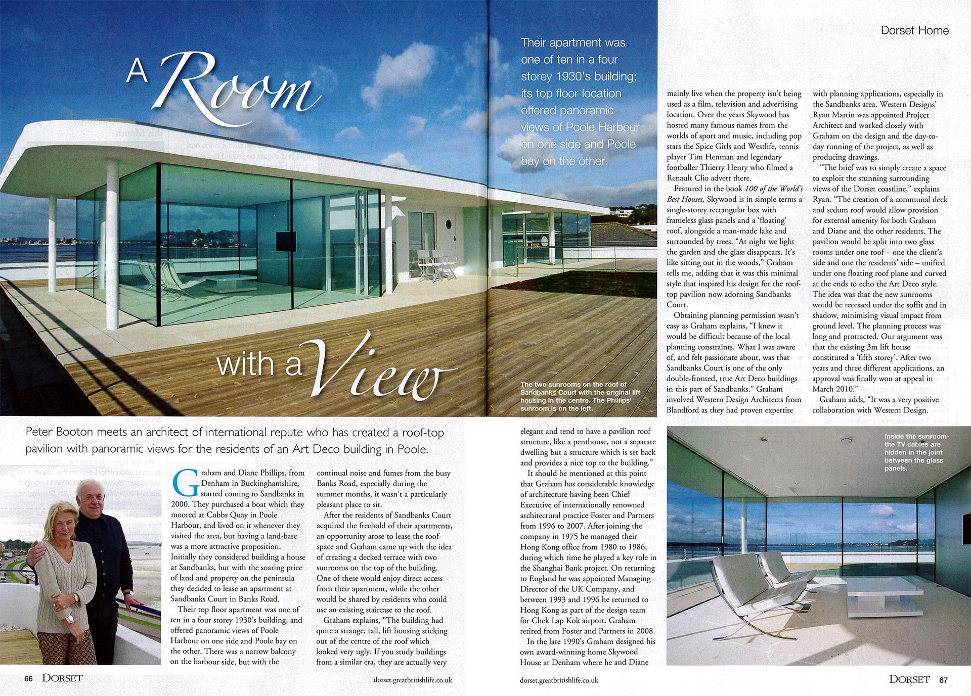 This pavilion in collaboration with Graham Phillips is unified under a single “floating” roof plane. Two glass sunrooms on top of this Art Deco apartment block in Poole create simple, contemplative spaces. These enjoy stunning far-reaching Dorset coastline and harbour views.
