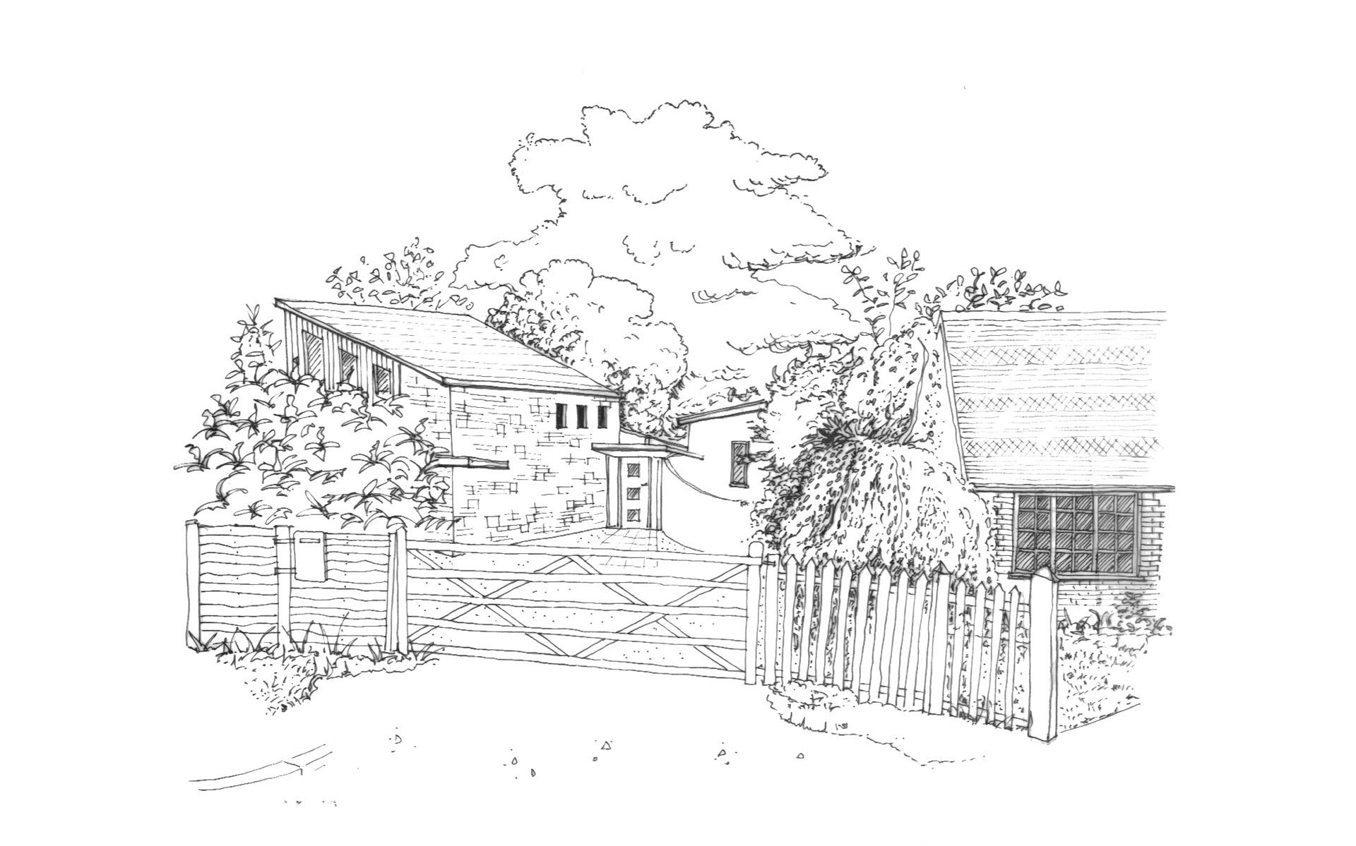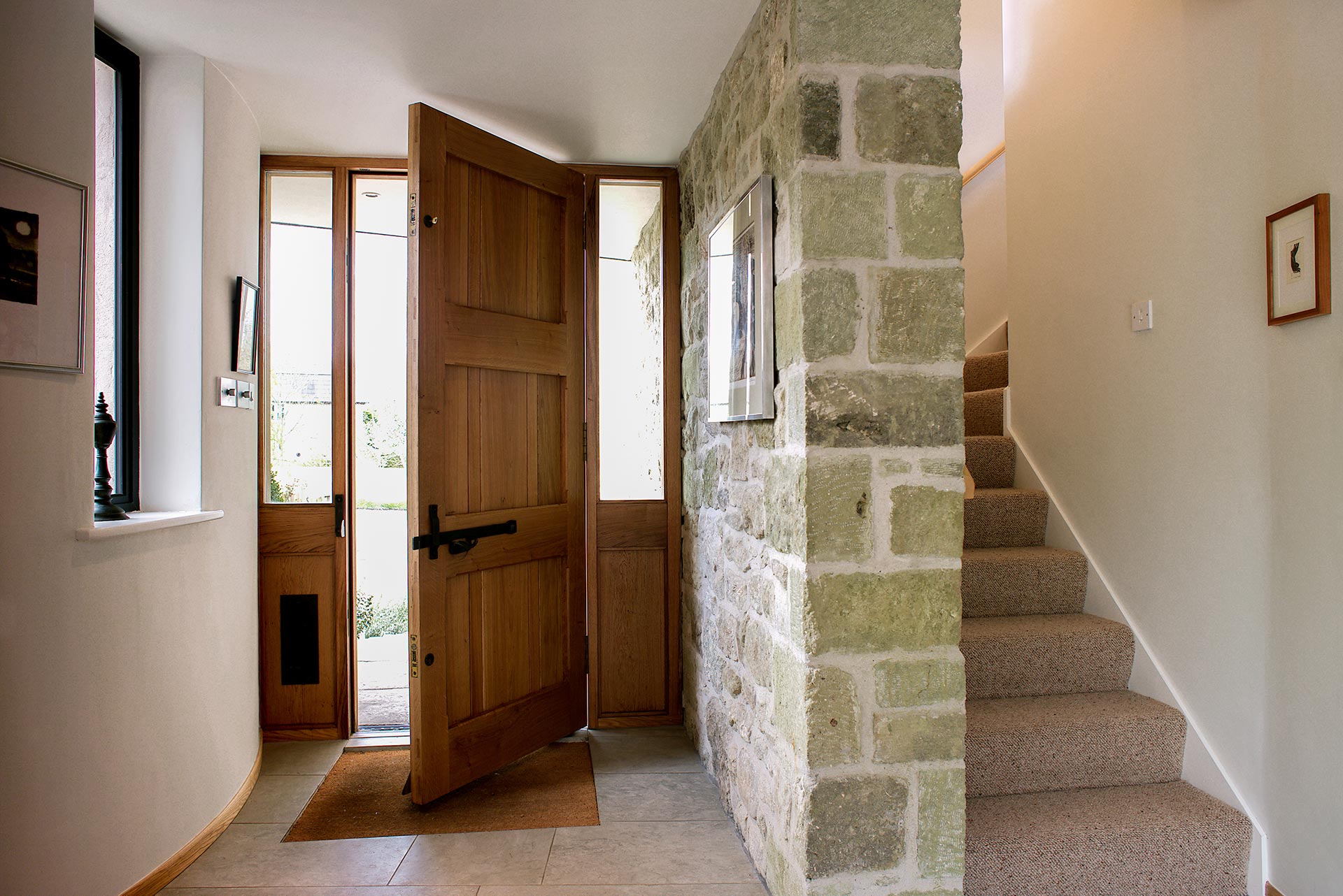 This modern cottage is mainly single storey with guest suite accommodation above the garage. The front elevation is composed of a monopitch element with traditional Shaftsbury Greensand Stone walls under a slate roof. A single storey entrance to the side has curved white rendered walls below a flat roof.