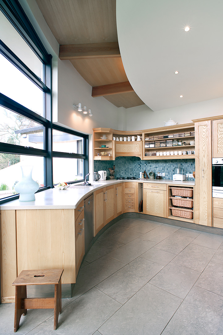 Beyond the bespoke oak front door is a long entrance dining hall, library, top lit by a glass lantern. This inviting circulation space gives access to the study bedrooms, bath and utility rooms. Opposite is a semi-circular and open plan living area and award-winning bespoke kitchen, the hand made purpose built units are constructed in cherry with a concrete work surface. The curved living space is reflected in the unique ceiling detail, composed of exposed radiating joists and subtle concealed lighting.