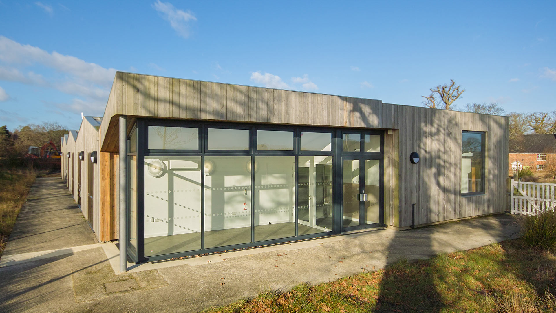 visual of extension for spinal injury centre with external wood cladding surrounded by countryside