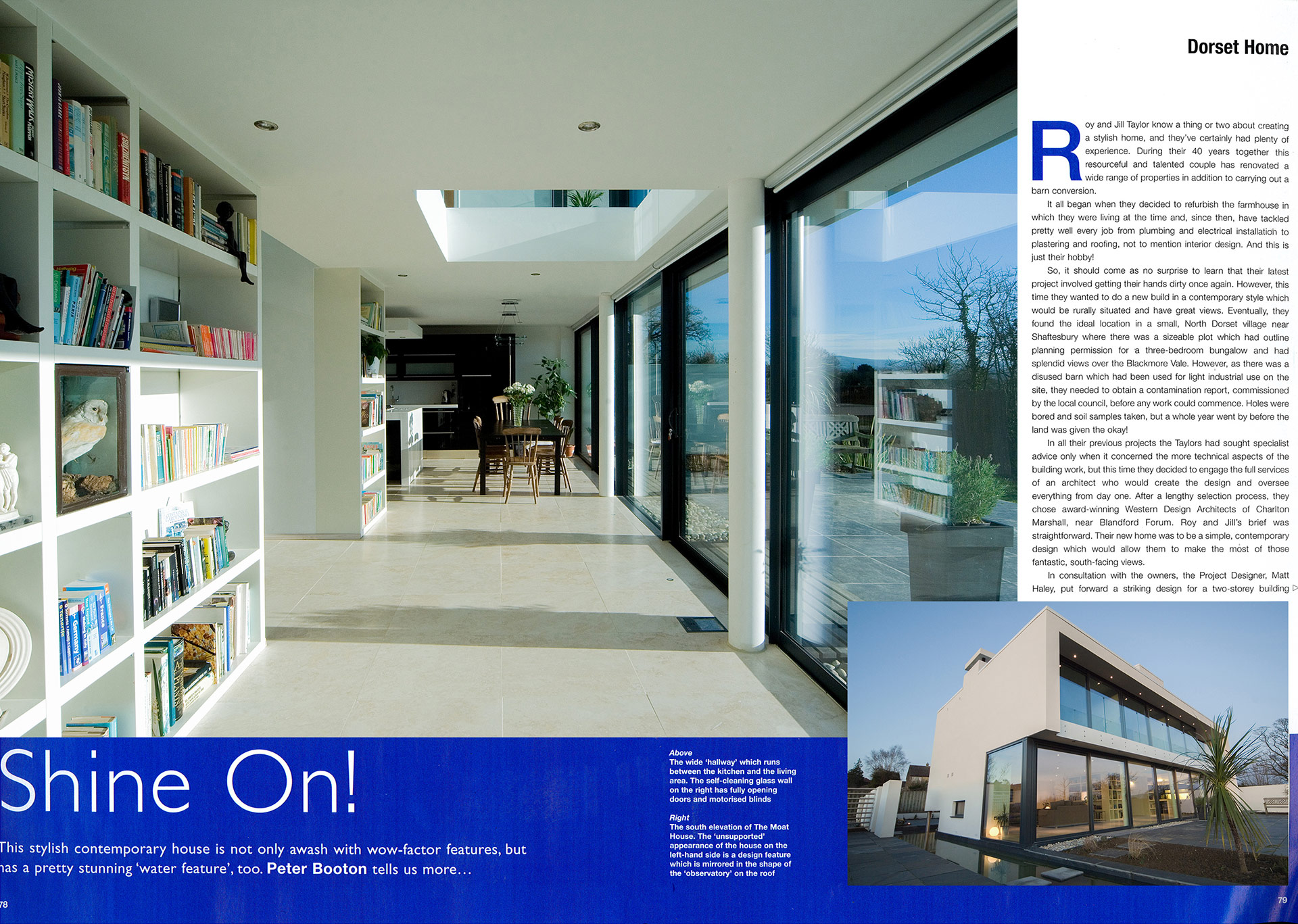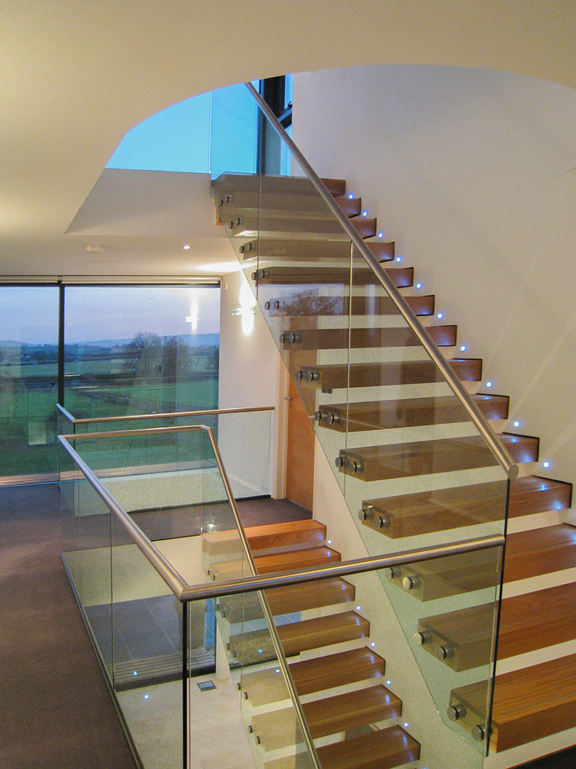 The interior is light and spacious with each room flowing into each other due to its clever open plan layout. The entrance hall features a cantilevered staircase rising to the first and second floor observatory above.