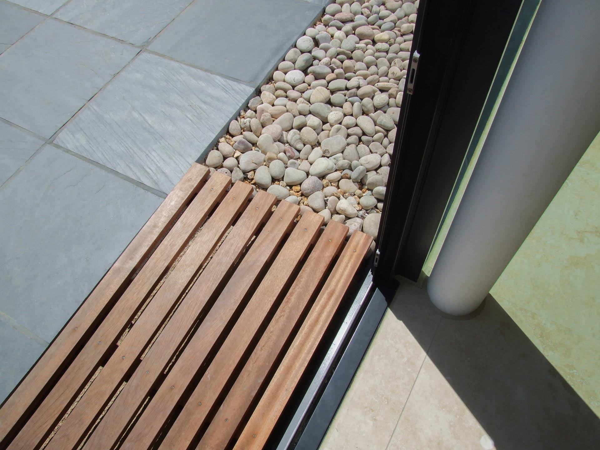 The front door is reached by crossing a timber bridge over a water filled water channel which runs around the edge of the house and crossing the terrace to the rear to discharge into a galvanised steel water trough. Stepping stones in the channel allow access over the rear terrace.