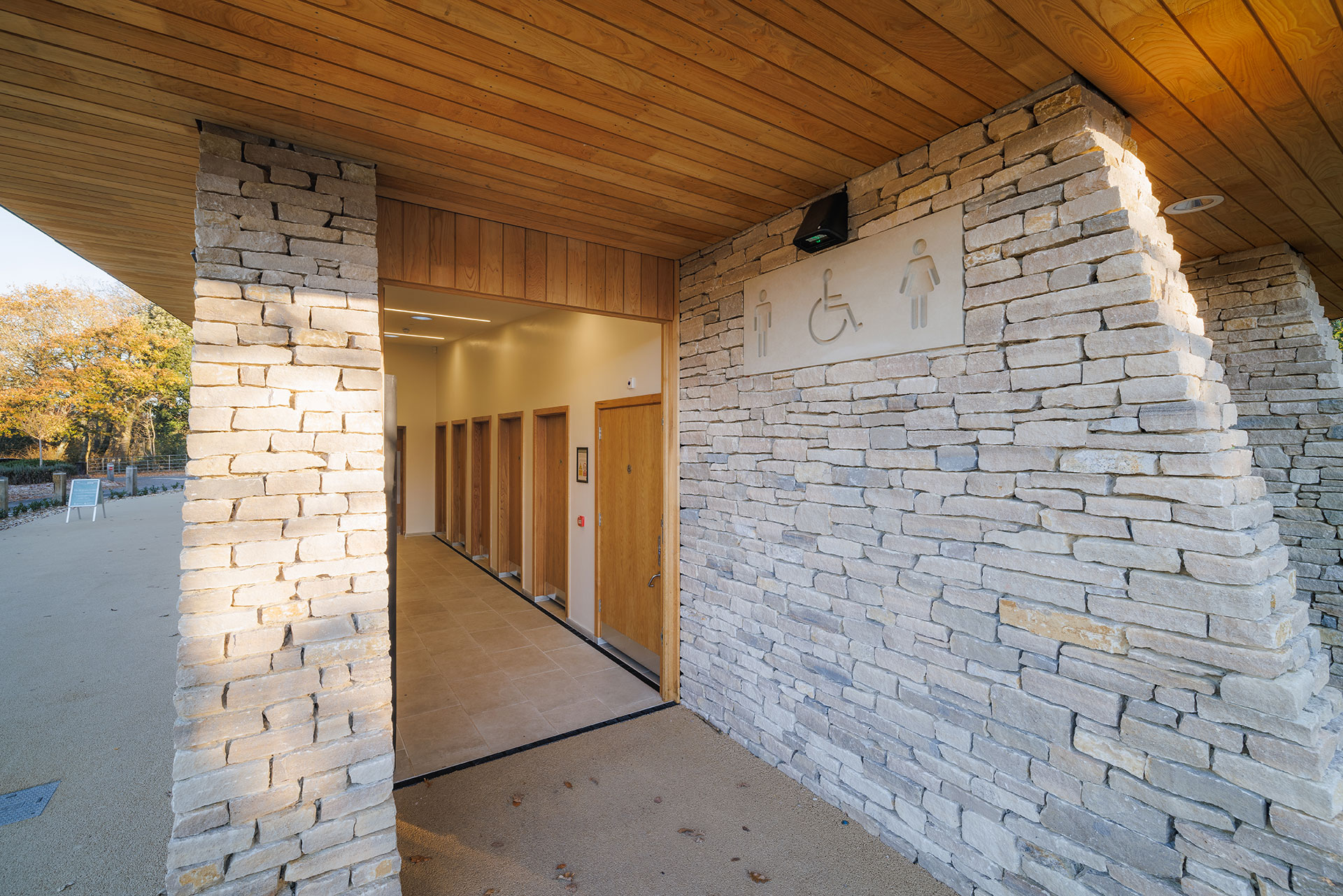 The Welcome Centre employs a natural material palette echoing the surrounding landscape. Purbeck dry stone walls, chestnut timber cladding and limestone signage help root the building within its context which is further enhanced with the biodiverse green roof, planted with 34 species of wildflowers. Insect hotels, swallow cups and bat boxes all aid with enhancing the biodiversity on site whilst the wisteria climbers help to connect the building with the historic tree lined carriageway behind.