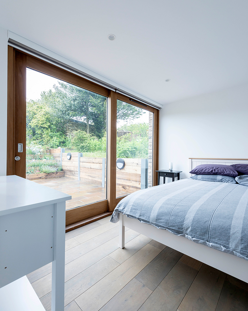 The open plan dining area and living room are set off by two wonderful glazed gable windows at either end of the interior space, with continuous strip concealed dimmable LED lighting at eaves level. This creates an attractive ambience without shining out directly into the dark skies of the AONB.