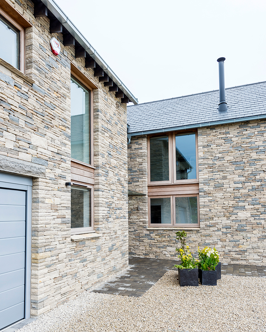 This contemporary house’s primary material is local stone from Bonfields quarry, literally across the road from the site, In conjunction with our clients, we visited the quarry and chose all the stone ourselves. The quality and colour of the stone was quite exceptional as was the craftsmanship of the masons. The stonework links the outside through to the interior walls of the stairwell. Corrugated iron was used for the roofing, as it is a traditional material in the area.