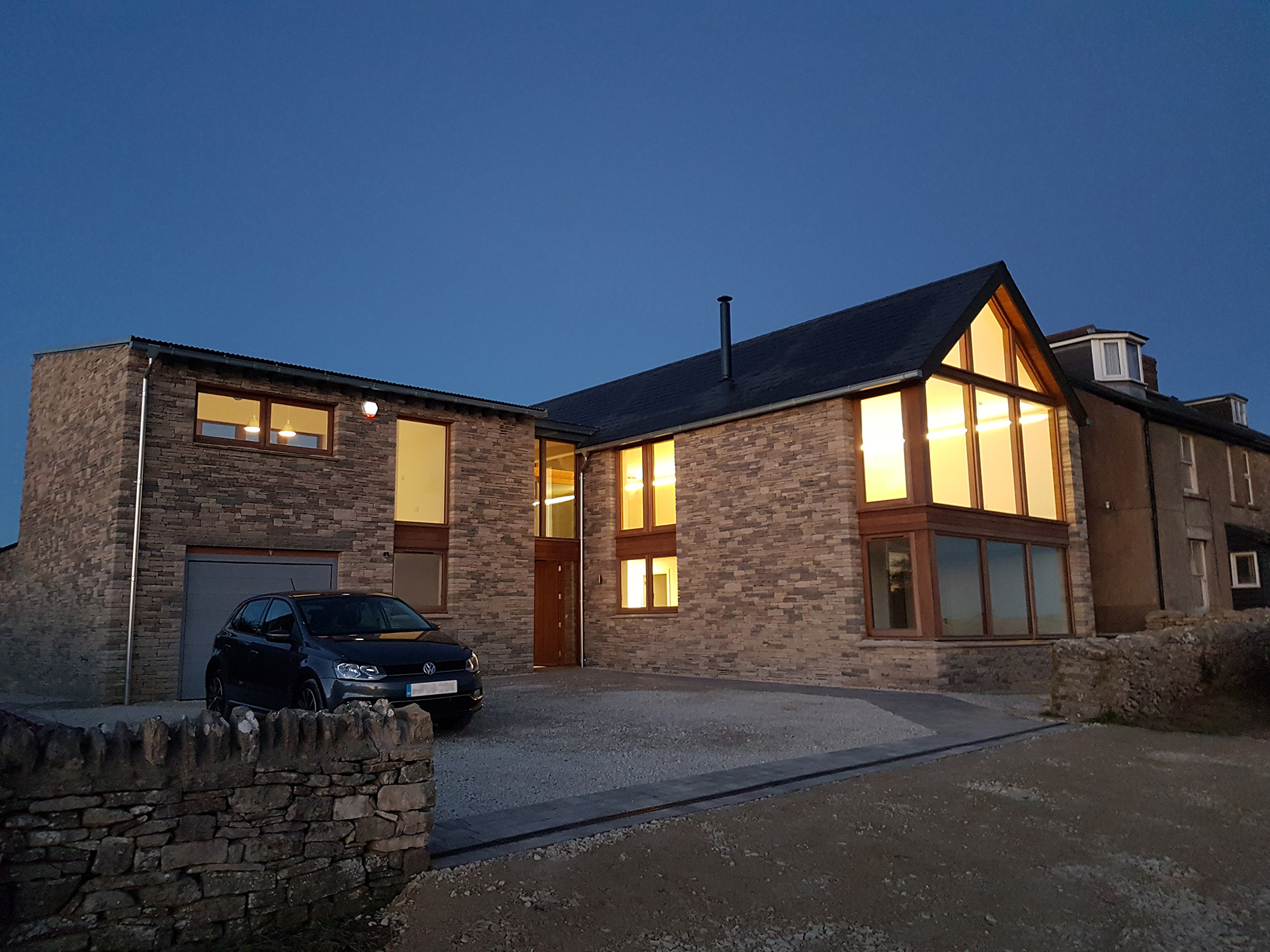 The original concept was for two simple mono-pitch forms linked by a full height glazed stairwell/entrance hall. The style reflects the mono pitch roofed vernacular of the local quarry buildings. However, the planners insisted on a conventional pitched roof which WDA felt spoilt the integrity of the original design.